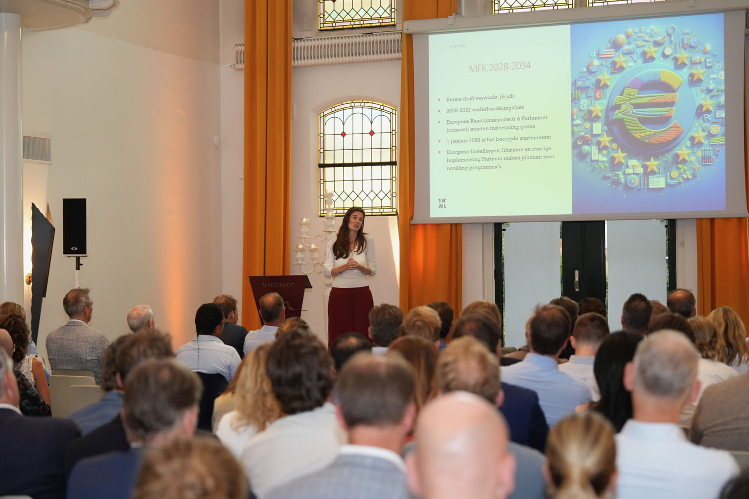 Na de pauze informeerde Jorine Zandhuis (Team Lead Europa Invest-NL) de zaal over de werkzaamheden en investeringen van InvestNL en de diverse samenwerkingen die aangegaan zijn met het EIF, CEB en InvestEU. Belangrijk voor toekomstige Europese financiering is het nieuwe MFK, het meerjarige financieringskader van 2028-2034. Dit kader wordt onder andere aan de hand van het Competitive Compass van de Europese Commissie vastgesteld, wat sterk is gebaseerd op het rapport van Draghi.